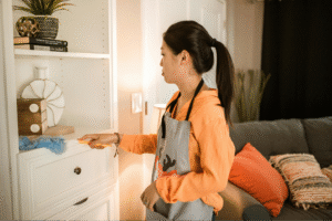 - – Áreas de estar y dormir: Por lo general, avanzará más rápido en el resto del apartamento. Esto incluye aspirar y trapear los pisos, eliminar el polvo y la suciedad de todas las superficies, y limpiar las paredes de polvo, telarañas y manchas.